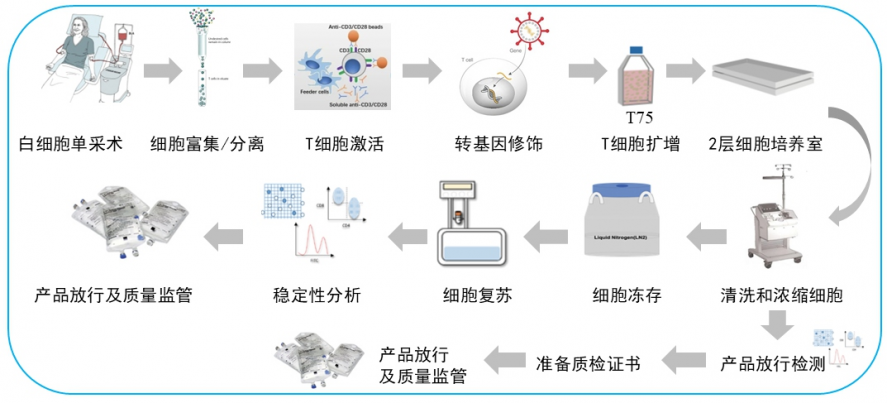 •  CAR-T therapy is an immunotherapy that uses gene engineering technologies such as viral vectors or electroporation to implant chimeric antigen receptors (CARs) that specifically recognize tumor-associated antigens and simultaneously activate T cells into the patient's T lymphocytes. These CAR-T cells are then purified and expanded in vitro before being reinfused, allowing them to inhibit and kill tumors. • Shenzhen Cell Cell Technology Co., Ltd. can provide R&D and outsourced production services for CAR-T cells targeting different targets . Currently, it has successfully used its self-produced industrial-grade retroviral vectors to prepare multiple CAR-T cell lines targeting CD19, CD38, and BCMA-CD38 dual targets , with transduction efficiencies exceeding 70%. It can complete the entire process from T lymphocyte collection, transduction of tumor-targeting viral vectors , CAR-T cell expansion, safety testing, and release. Currently, it provides GMP-grade CAR-T cell production services to institutions such as Huazhong University of Science and Technology Union Hospital and Shenzhen Hospital.