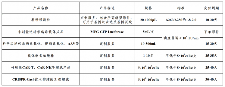 •  If commercialization of the resultsis required later,retroviral vectorsand cell products can beseamlessly integrated intoGMP-levelproduction servicesultra-low cost ; •  Retroviral vectorscan carrylarge target fragmentsup to 7kb ; •  ForNK cellsthat are difficult to infect withlentivirusesthe transduction efficiencyusingretroviralover 50%,with a viability rate of over 95%; •  A professional technical team providesfull-process technical supportto ensure the smooth progress of the project.