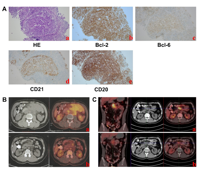 图2. CAR-T输注前的PET-CT图像及病理切片。(A) CAR-T输注前腹部肿块病理结果。a:苏木精伊红染色。b-e: Bcl-2阳性,Bcl-6阳性,CD21阳性,CD20阳性。(B)腹部初始诊断及有效治疗的PET-CT影像时间。a:2021-5-26。b: 2021-12-14。(C)腹部复发PET-CT时间及免疫维持治疗。a:2023-2-16。b: 2023-9-5。