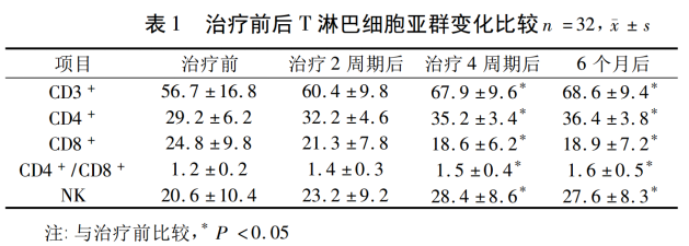 32 例亚健康患者经自体NK细胞治疗4周期及6个月后外周血 CD8 + 细胞较治疗前下降,CD3 + 、CD4 + 及 CD4 + /CD8 + 比值较治疗前均升高,差异有统计学意义。治疗4周期及6个月后疲劳程度较治疗前明显减轻。自体NK细胞免疫治疗可缓解亚健康人群的疲劳症状,并增强其细胞免疫功能,提高生活质量[5]